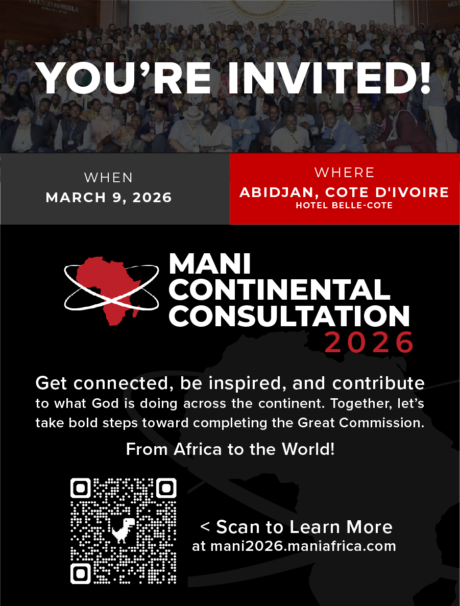 Be part of a catalytic moment as leaders from across Africa and beyond gather for the MANI 2026 Continental Consultation—a strategic movement mobilizing the African Church for its leading role in fulfilling the Great Commission. This historic gathering will focus on empowering national initiatives, strengthening partnerships, and amplifying the voice and vision of Africa in global missions.